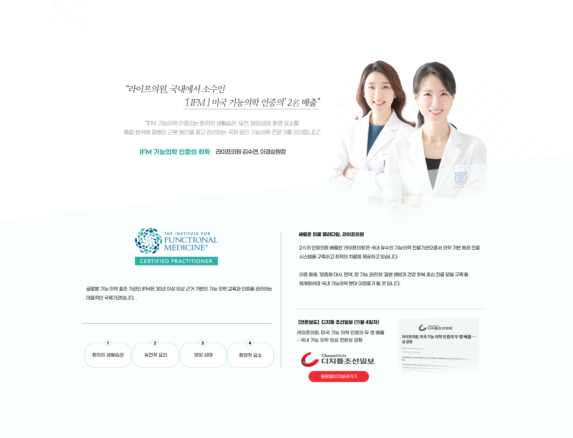라이프의원은 최첨단 의료서비스로 편안하고 안전한 진료를 가장 기본으로 합니다. 또한 통합진료와 의료 안전설비를 설계하여 다양한 질환을 치료하고 비수술적 치료로 검진부터 치료까지 원스톱 서비스를 제공합니다. 병원내 모든 치료 및 회복까지 도와드립니다. 서울대 출신 최고의 실력과 경험을 갖춘 의료진, 고객의 편의만을 생각하는 스텝들이 고객님들의 건강을 이끌어내도록 노력하겠습니다.